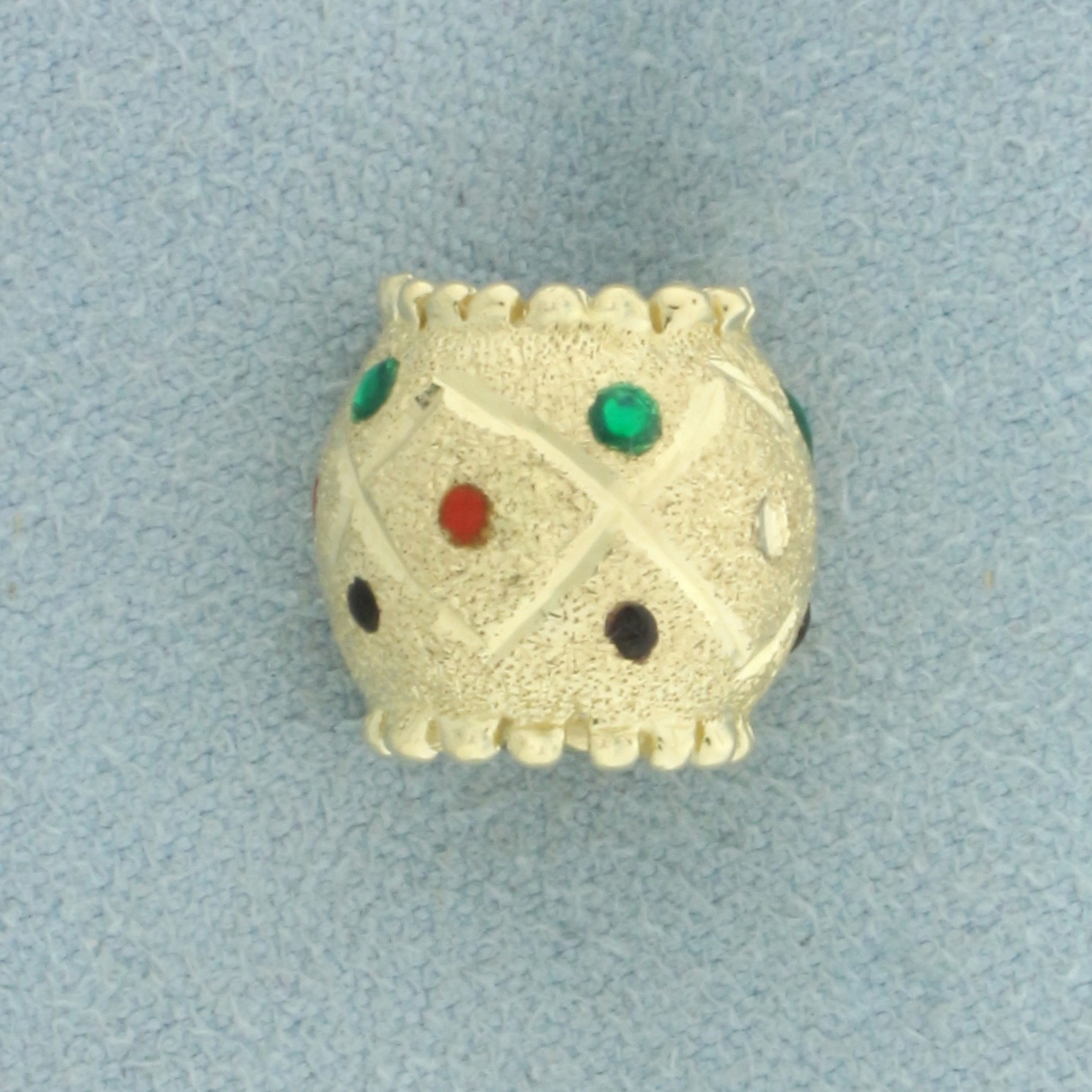 In 10k yellow gold. 1/2 inch long and 1/2 inches wide. Enamel looks like ruby, emerald, and sapphire gemstones. 3.2g.