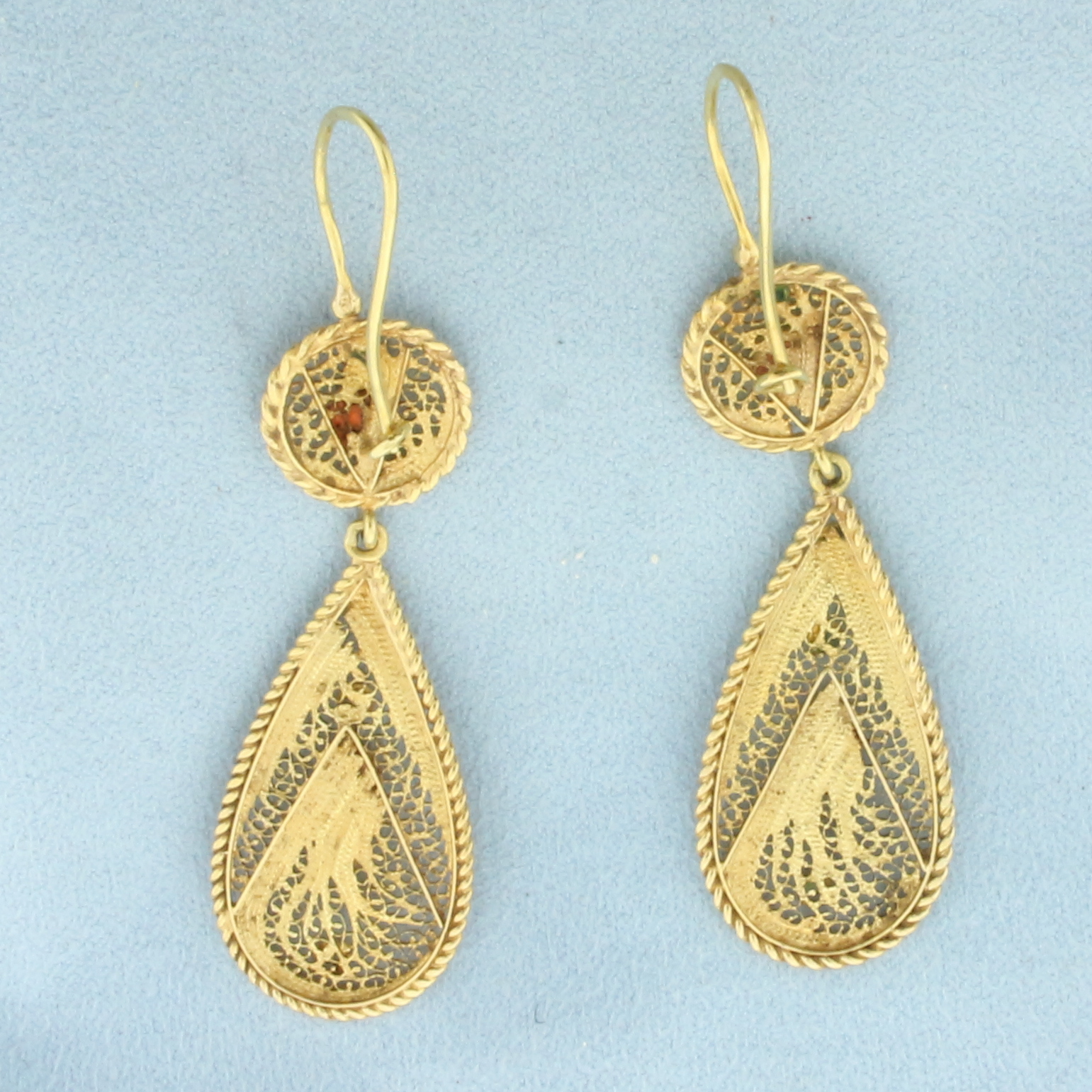 In 21k Yellow Gold. Orange and green enamel accents. 2 3/4 inch long. 3/4 inch wide. Kidney wire backs. 12.1g.