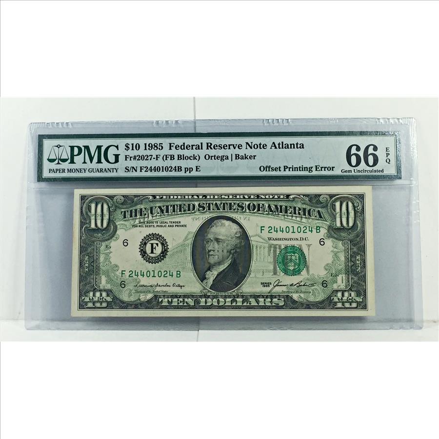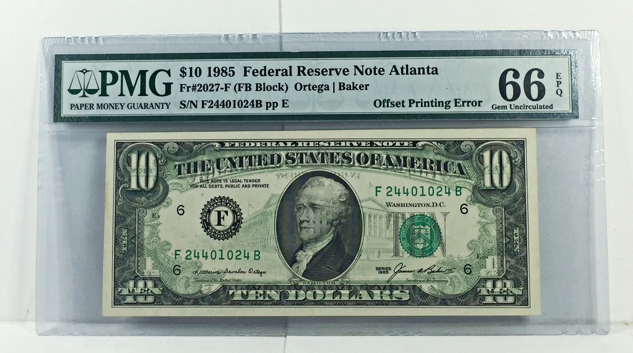 ERROR 1985 $10 Federal Reserve Note - Atlanta - Offset Printing Error - PMG Graded Gem Uncirculated 66 EPQ