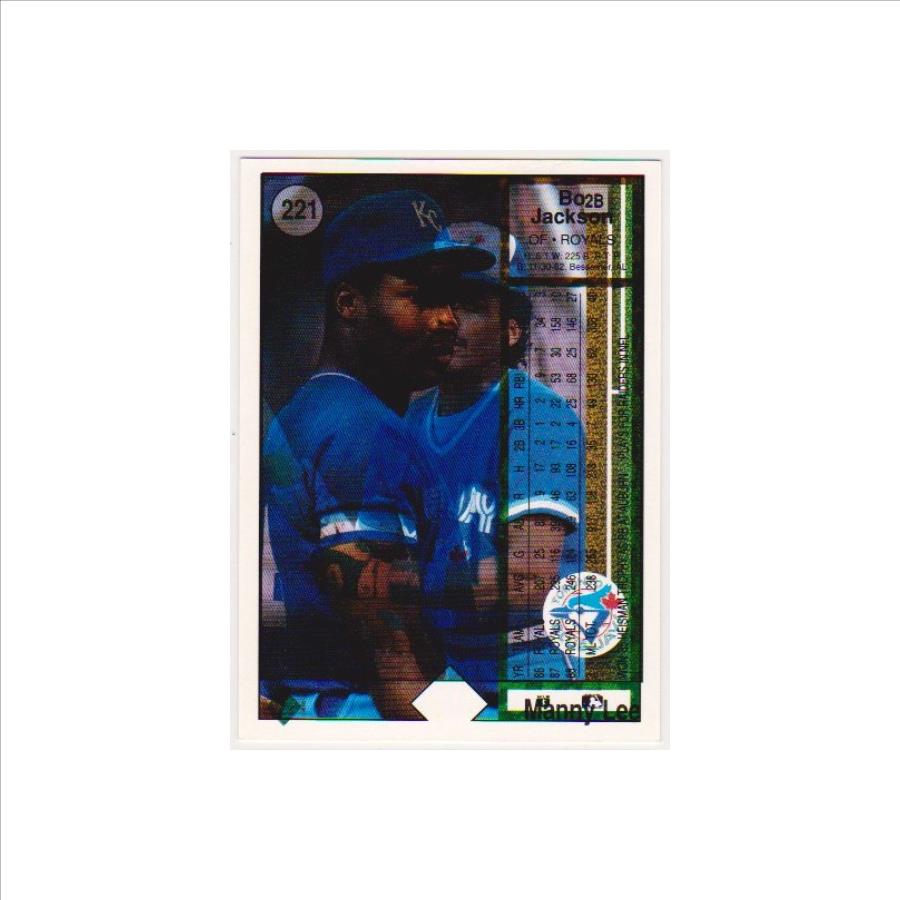 This is a 1989 Upper Deck Bo Jackson card with a very unusual error.  It has a normal Bo Jackson front. However, it has a double printed back with the normal Jackson back plus a Manny Lee back so everything is scrambled.  Normally errors like this are destroyed at the factory making them very tough to find in packs.  It has minor wear and is a little off center, but is in approximately Excellent overall condition.  This is a neat looking error card of this retired baseball All-Star.