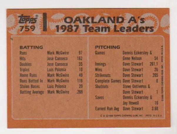 1988 Topps Will Clark wrong back error card.  This card has the normal looking Clark front.  However, the sheet it was printed on was lined up wrong when being printed by Topps and this one has an Oakland A's Team Leaders back.  Very few of these errors ever get out of the card factory as they are normally destroyed when it is discovered.  However, this one did and it is a sharp NM-MT condition card.  This is a great error card featuring retired star Will Clark.