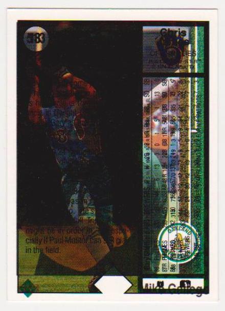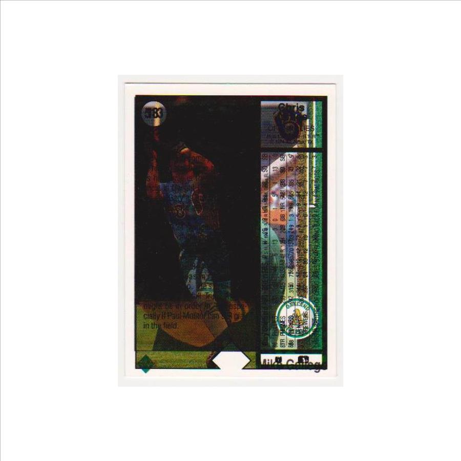 This is a 1989 Upper Deck Gary Sheffield rookie card with a very unusual error.  The front of the card is the regular looking Sheffield rookie but the back has been triple printed.  It was printed once with the Sheffield back and then it was printed a 2nd time with Chris James back and a third time with a Mike Gallego front so everything is scrambled.  Normally errors like this are destroyed at the factory making them very tough to find in packs.  The card has minor wear which is common with any of these errors that did get out but overall displays nicely in a holder.