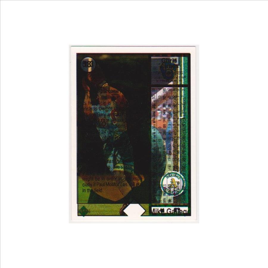 This is a 1989 Upper Deck Gary Sheffield rookie card with a very unusual error.  The front of the card is the regular looking Sheffield rookie but the back has been triple printed.  It was printed once with the Sheffield back and then it was printed a 2nd time with Chris James back and a third time with a Mike Gallego front so everything is scrambled.  Normally errors like this are destroyed at the factory making them very tough to find in packs.  The card has a light crease and is a little off center, but is in approximately Very Good overall condition.