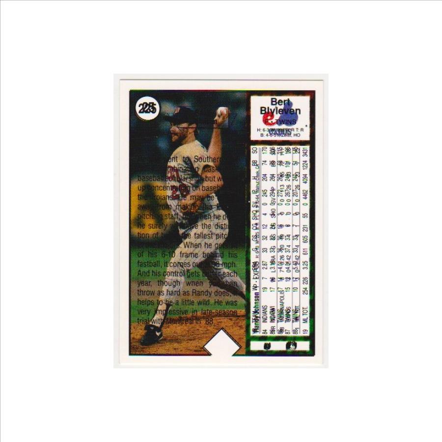 This is a 1989 Upper Deck Randy Johnson rookie card with a very unusual error.  It has a double printed back with a Randy Johnson and Bert Blyleven back so everything is scrambled.   It has a Shadow Print Bert Blyleven front. It is in approximately EX condition. It has some light surface wear, but overall this is a nice error card featuring two baseball Hall Of Famers.