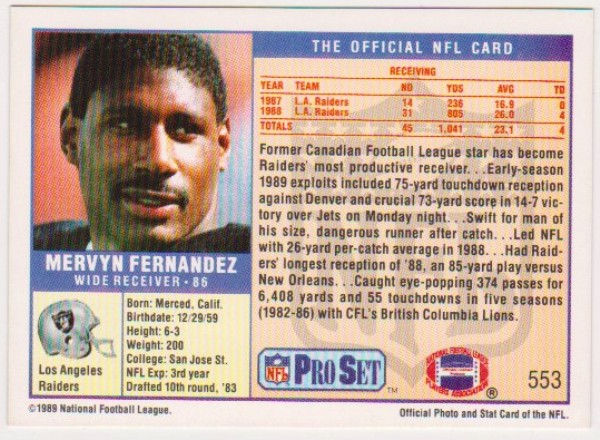 This is a 1989 Pro Set Super Bowl XXIV Steve Young wrong back error card.  This one has a Mervyn Fernandez #553  back instead of the normal Young back.  This card is in approximately EX-MT condition. It has minor wear including a small print spot on the left edge, and is just slightly miscut, but overall displays nicely.