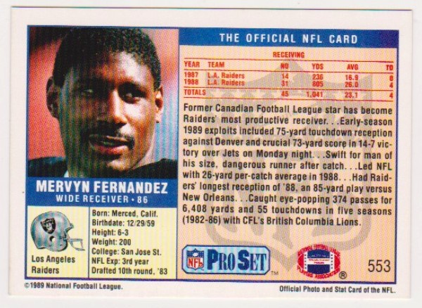 This is a 1989 Pro Set Super Bowl XXIV Steve Young wrong back error card.  This one has a Mervyn Fernandez #553  back instead of the normal Young back.  This card is in approximately EX condition. It has minor wear and is off center, but overall displays pretty well.