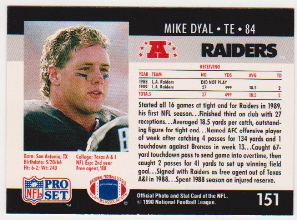 This is a 1990 Pro Set Thurman Thomas error card.  This card has a correct front but has a Mike Dyal #151 back. It is in approximately Near Mint condition.