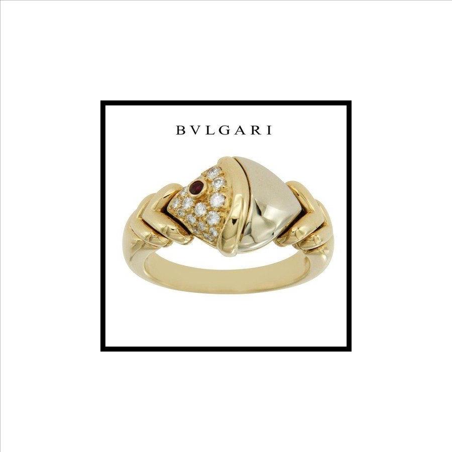 Estate BVLGARI Tow Tone Natural Diamonds & Ruby 18k Gold Ring Size 5