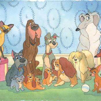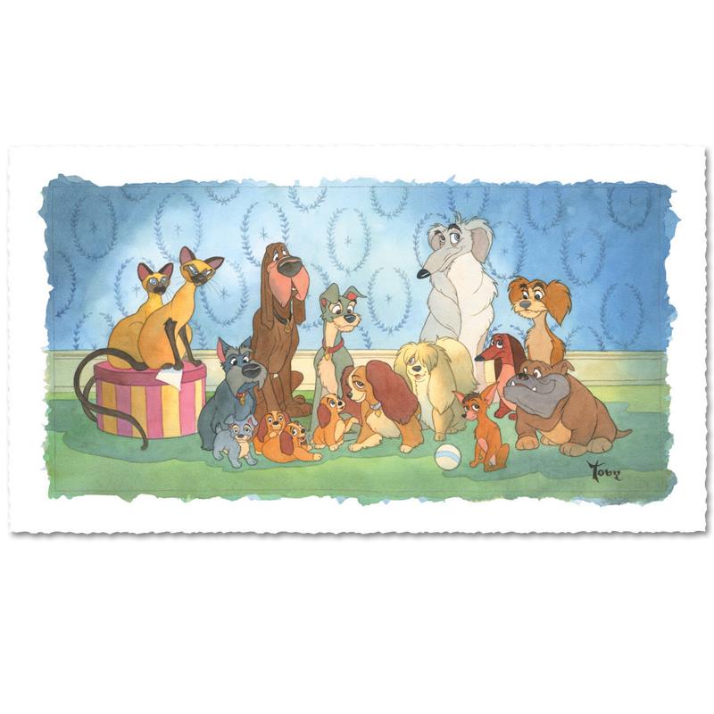 "Family Portrait" limited edition giclee on deckle edge paper by Toby Bluth from Disney Fine Art featuring classic Lady and the Tramp imagery. This piece comes numbered and is hand signed by the artist. It is accompanied by a certificate of authenticity from Disney Fine Art. Item measures approx 22 x 11 (image).