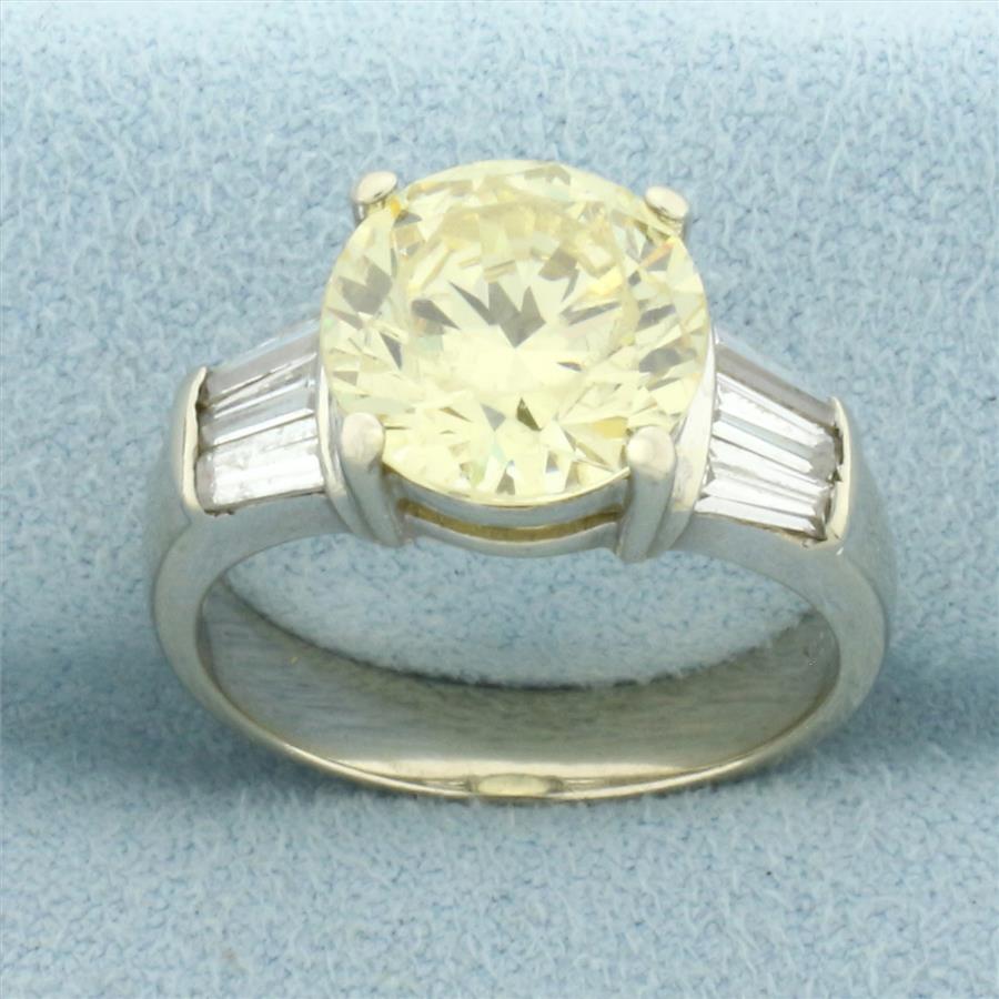 In 14k White Gold. Contains one 3.5ct high quality Fancy Yellow CZ gemstone with excellent cut and clarity for added brilliance. Also contains six 4mm tapered baguette CZ gemstones of similar high quality. Size 7. 6.2g.