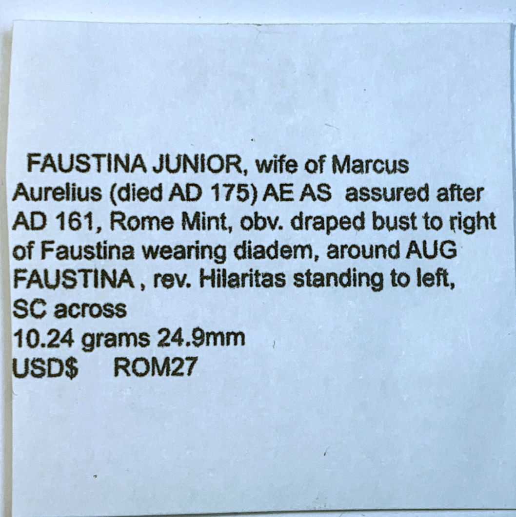 Faustina Jr Wife of Marcus Aurelius (Died 175 AD ) Bronze Asurion Rome
