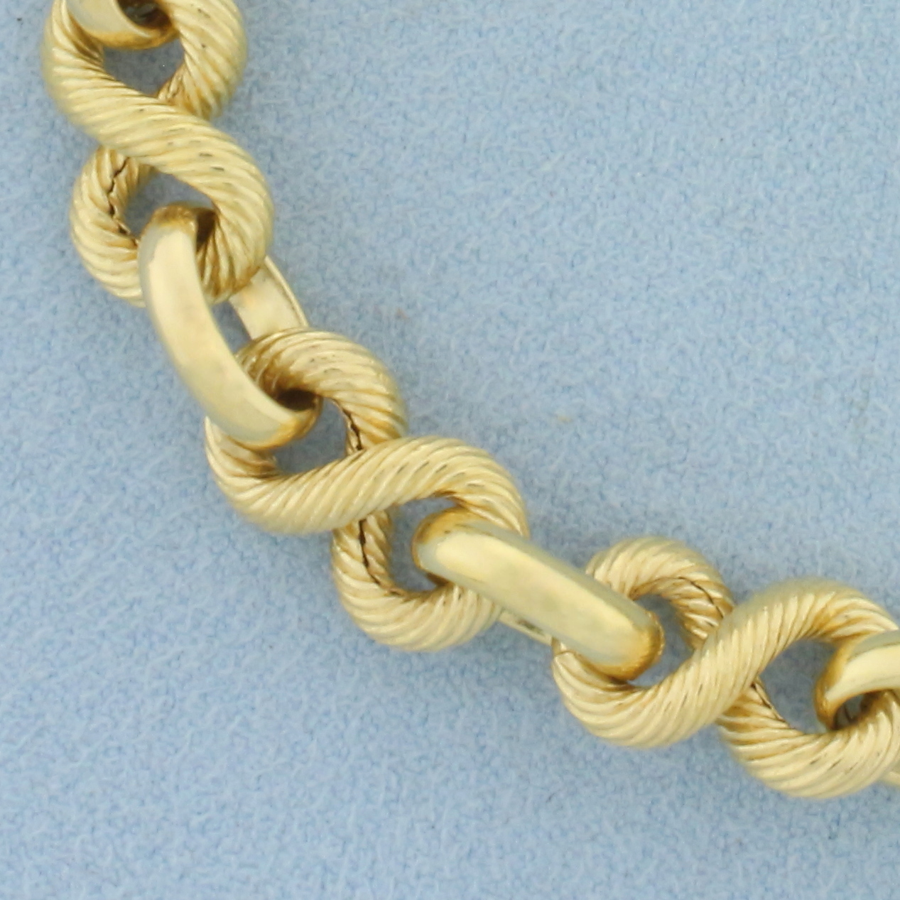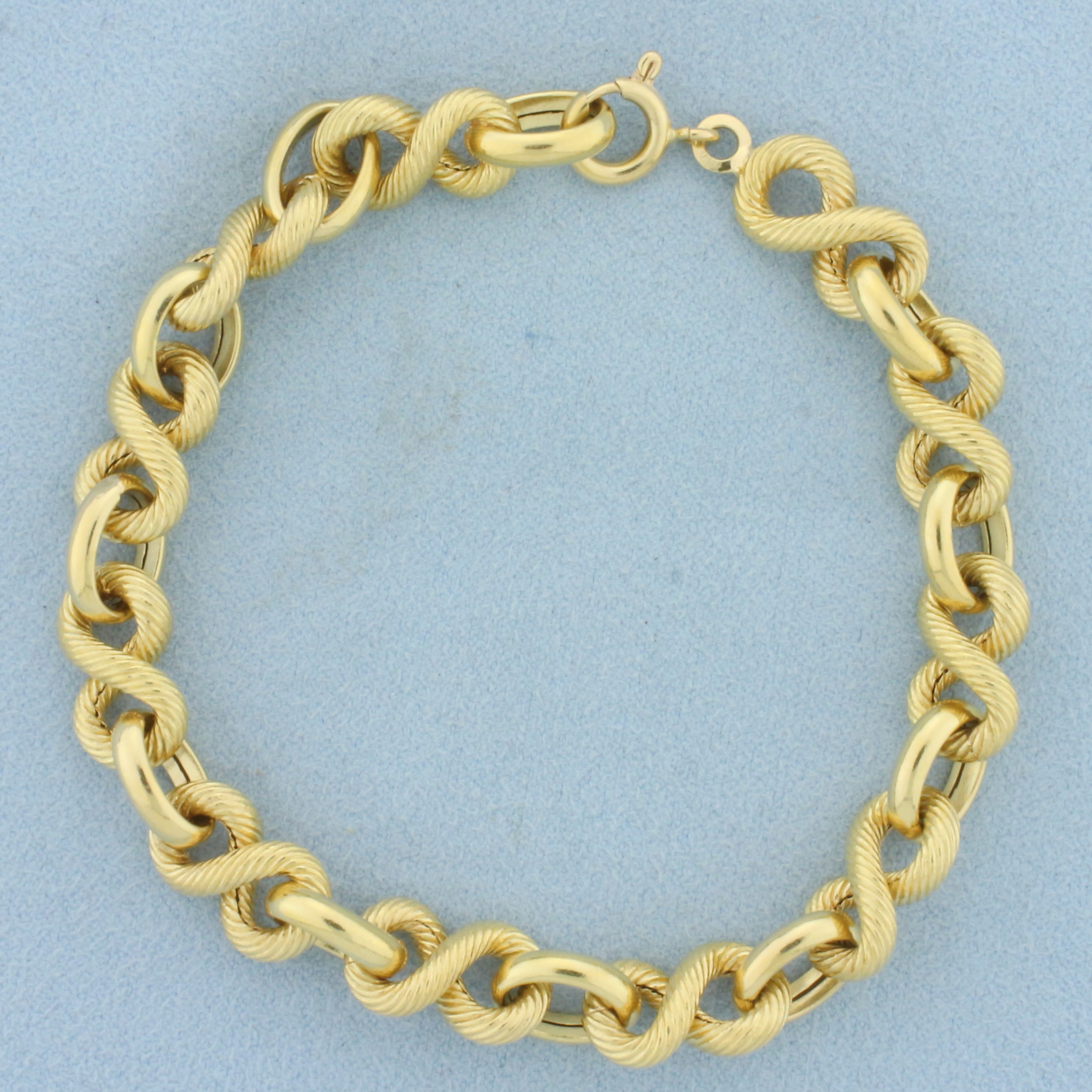 In 18k Yellow Gold. 8 3/8 inches long. 9mm wide at widest point. Spring clasp. 12.8g.