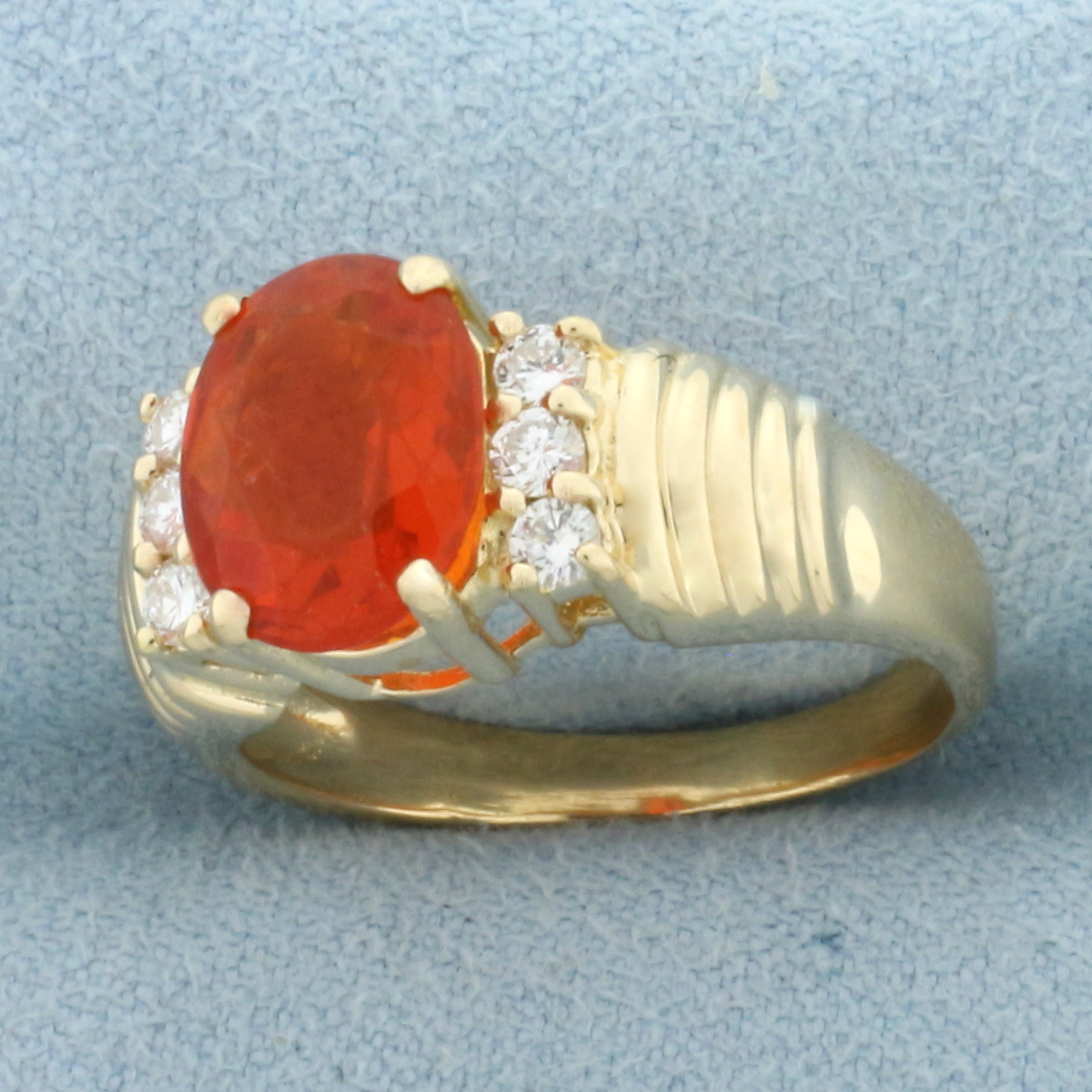 In 18k Yellow Gold. Contains one high quality natural 10mmx8mm fire opal with vibrant color and excellent clarity. Also contains six .03ct diamonds, VS clarity/G color. Size 7.5. 6.6g.