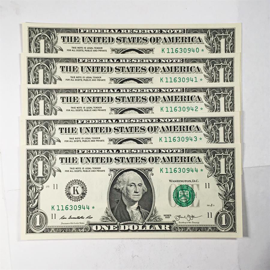 Five (5) Series 2013 $1 FRN; Dallas, TX*CONSECUTIVE NUMBERED STAR NOTES *Crisp Uncirculated