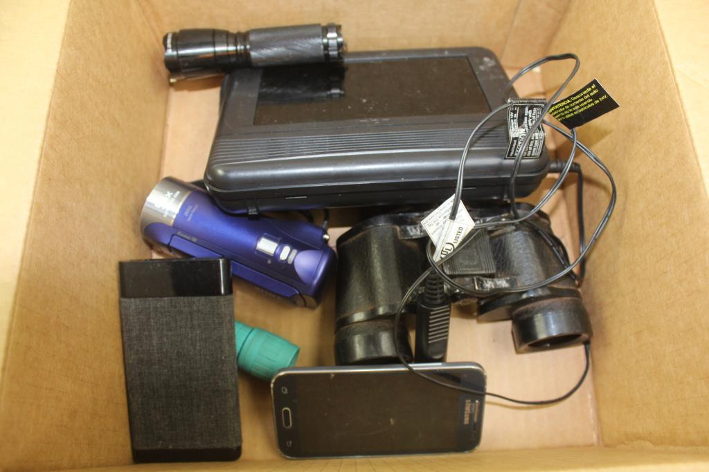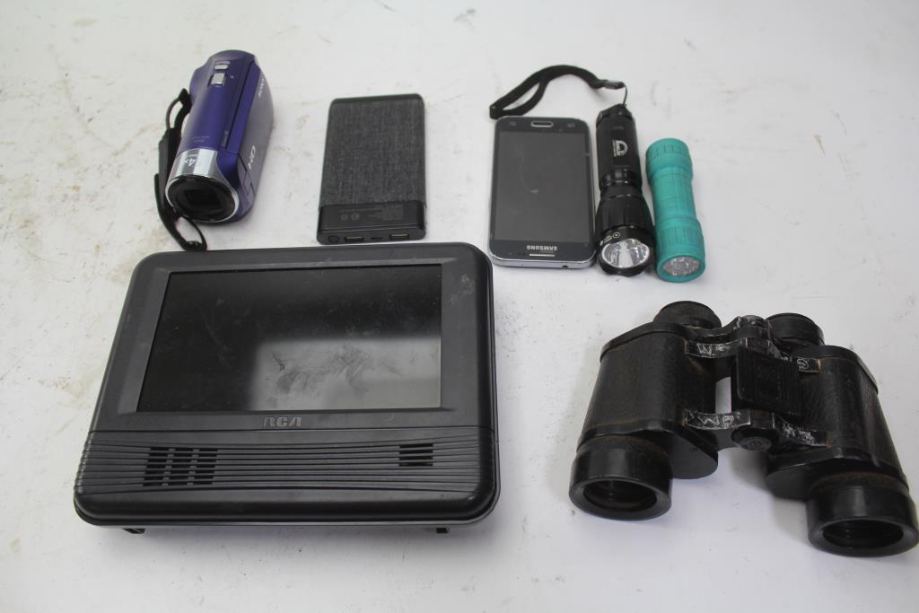 Flashlights, Rca Portable Monitor, Samsung Phone, Powerbank, Binoculars: 5+ Items