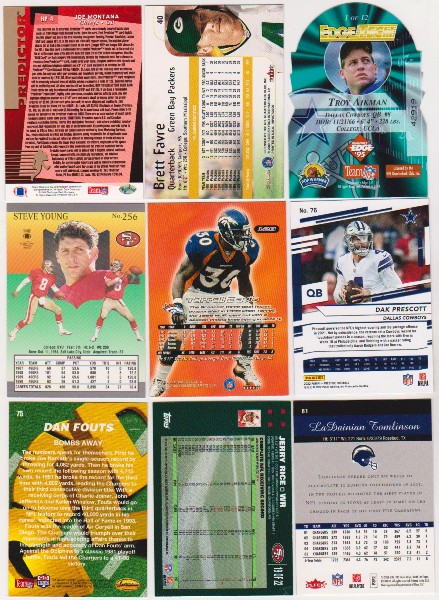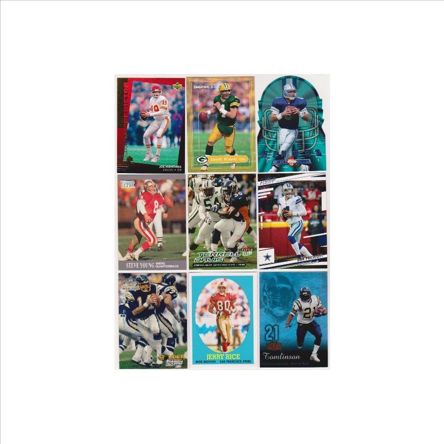 This is a collection of 9 different football cards of star and Hall of Fame players.  These range from 1991-2022.  This lot includes Joe Montana, Brett Favre, Troy Aikman, Steve Young, Terrell Davis, Dak Prescott, LaDainian Tomlinson, Jerry Rice, and Dan Fouts.   These are mostly in the EX-MT to Near Mint condition range.  This is a nice lot featuring a great mix of stars.