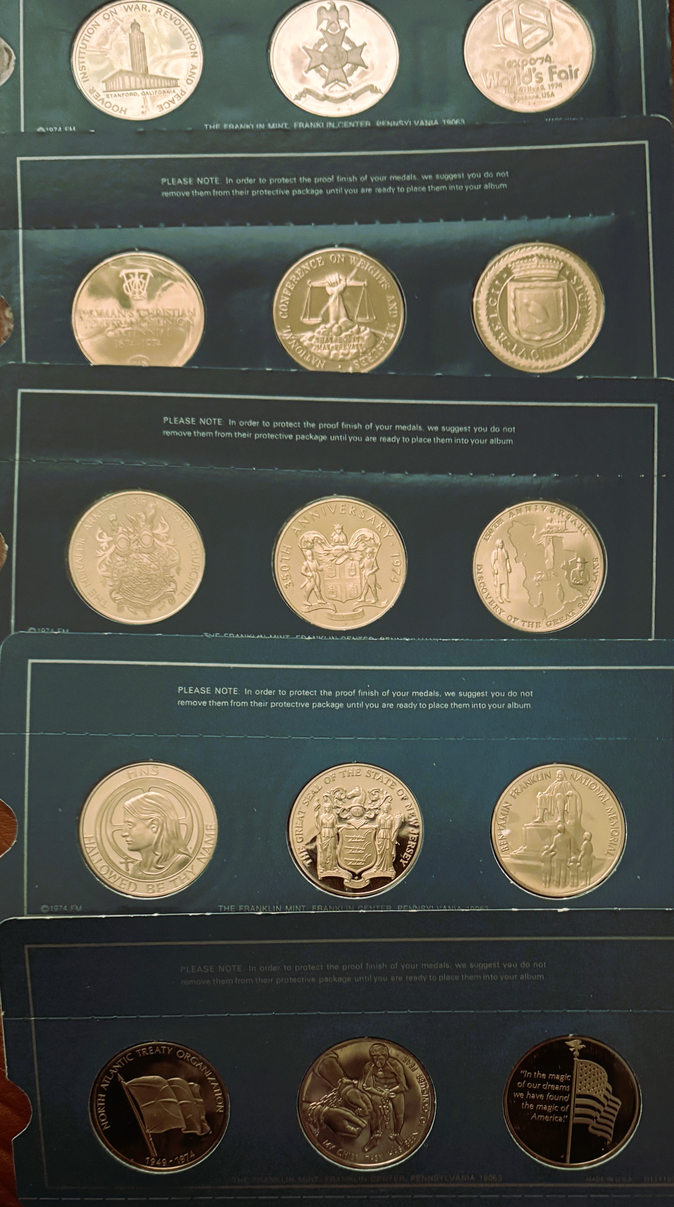 FRANKLIN MINT SPECIAL COMMEMORATIVE ISSUES OF 1973, 74, 75, FIRST EDITION PROOFS, 15 GEM COINS IN 5 ORIG SEALED PKG