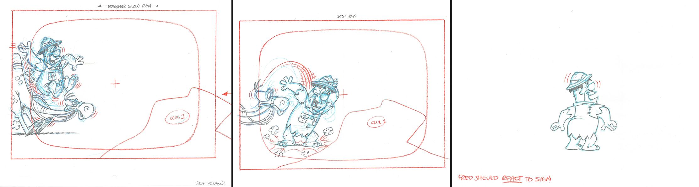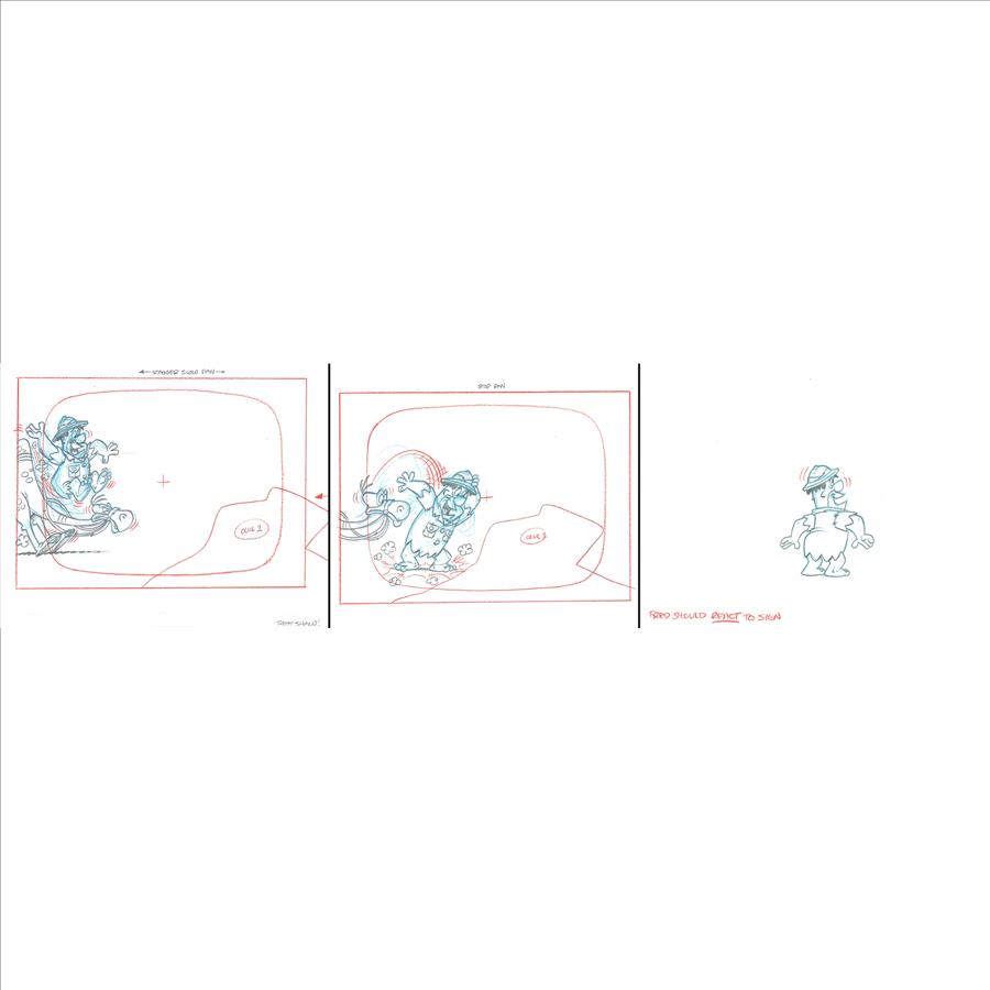 3 SIGNED original 16-Field production drawings of Fred Flintstone.  These were used in the Hanna-Barbera TV Commercials "Flintstones Fruity Pebbles" episode Tut-Rock which aired in the 1980's. It was produced by Playhouse Pictures Hollywood, created and signed by cartoonist and animator Scott Shaw. Playhouse Pictures, founded in the 1950's produced many well-known animation commercials, promotions and TV Openings, such as Hee-Haw, Rice Krispies, and Playboy.  Includes COA. Each is presented on 16-Field Paper - 16.5x13.5