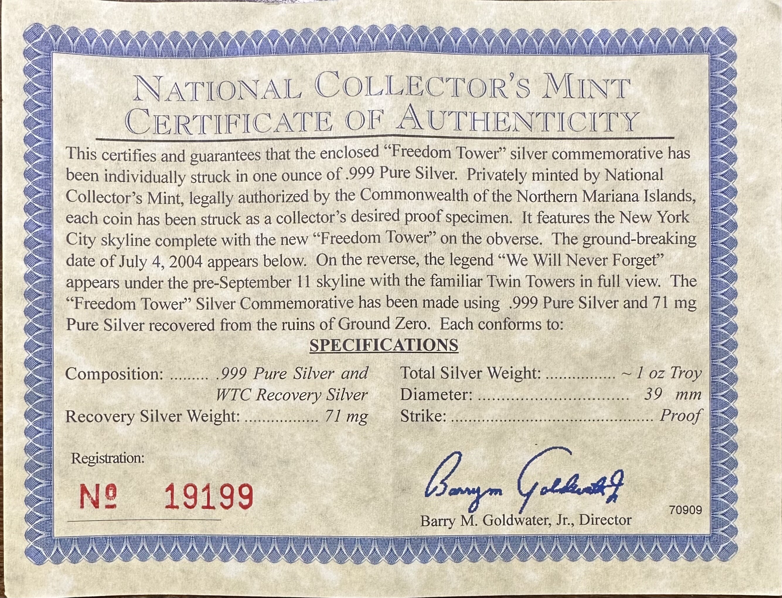 Freedom Tower Commemorative One Dollar Coin 1 Troy Oz .999 Pure Silver Recovered From Ground Zero "We Will Never Forget" & COA
