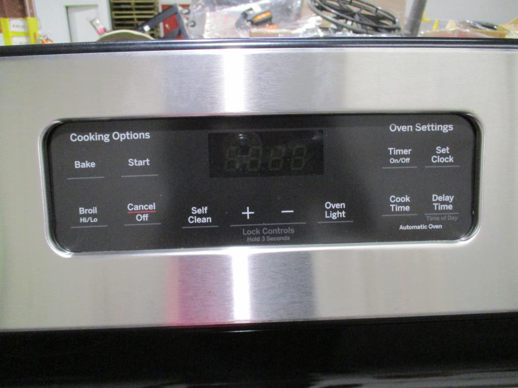 - Item info: electric, 2 shelf, broiler, 4 burners, high to low 4 knobs, burner light, buttons, bake, start, broil high to low, cancel/off, self clean, plus to minus, oven light, timer on and off, set clock, cook time, delay time