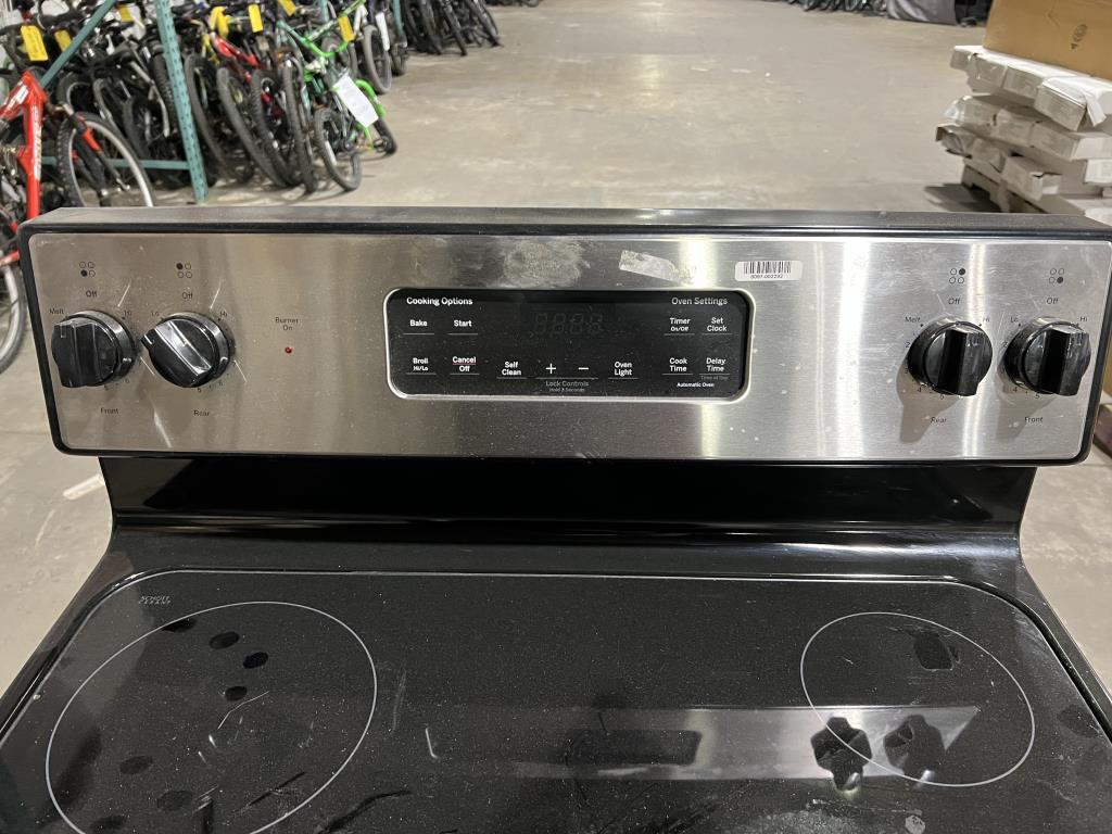 - Item info: Electric, 4 burners, 4 knobs, 2 knobs Hi-Melt, 2 knobs, Hi- Low, burner on, cook options, bake, start, broil-hilo, cancel off, self clean, oven light, timer on/off, set clock, cook time, delay time