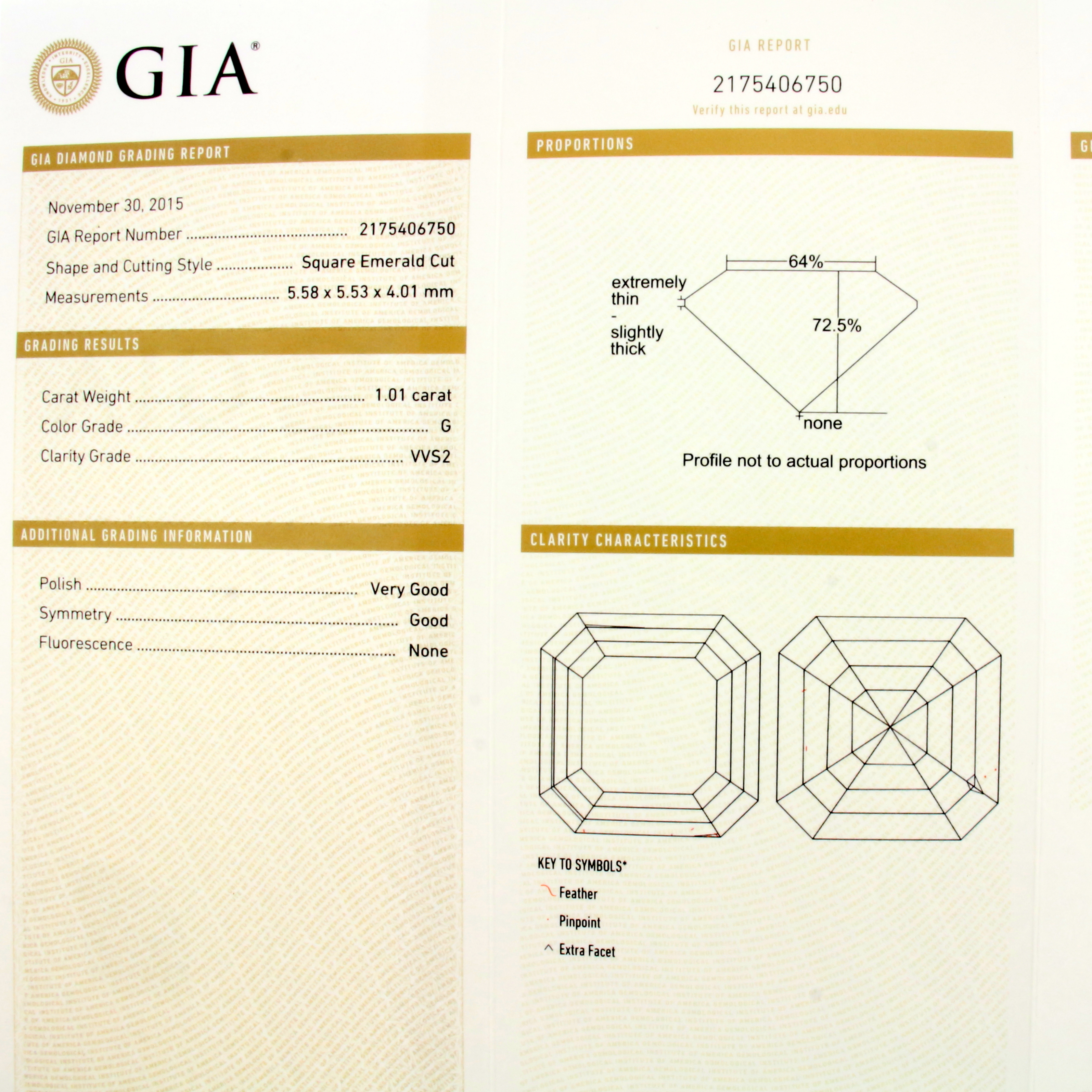 GIA certified. Very white G color and extremely high clarity VVS2. No fluorescence. Great cut too.