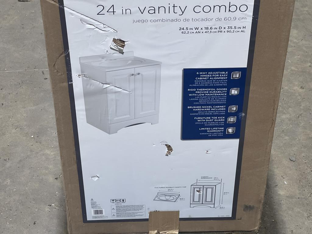 - Item info: 24 in vanity combo, 24.5" w x 18.6"D, 35.5" H, 6 way adjustable hinges, rigid thermo foil doors, brushed nickel cabinet, toe kick w/brush guard