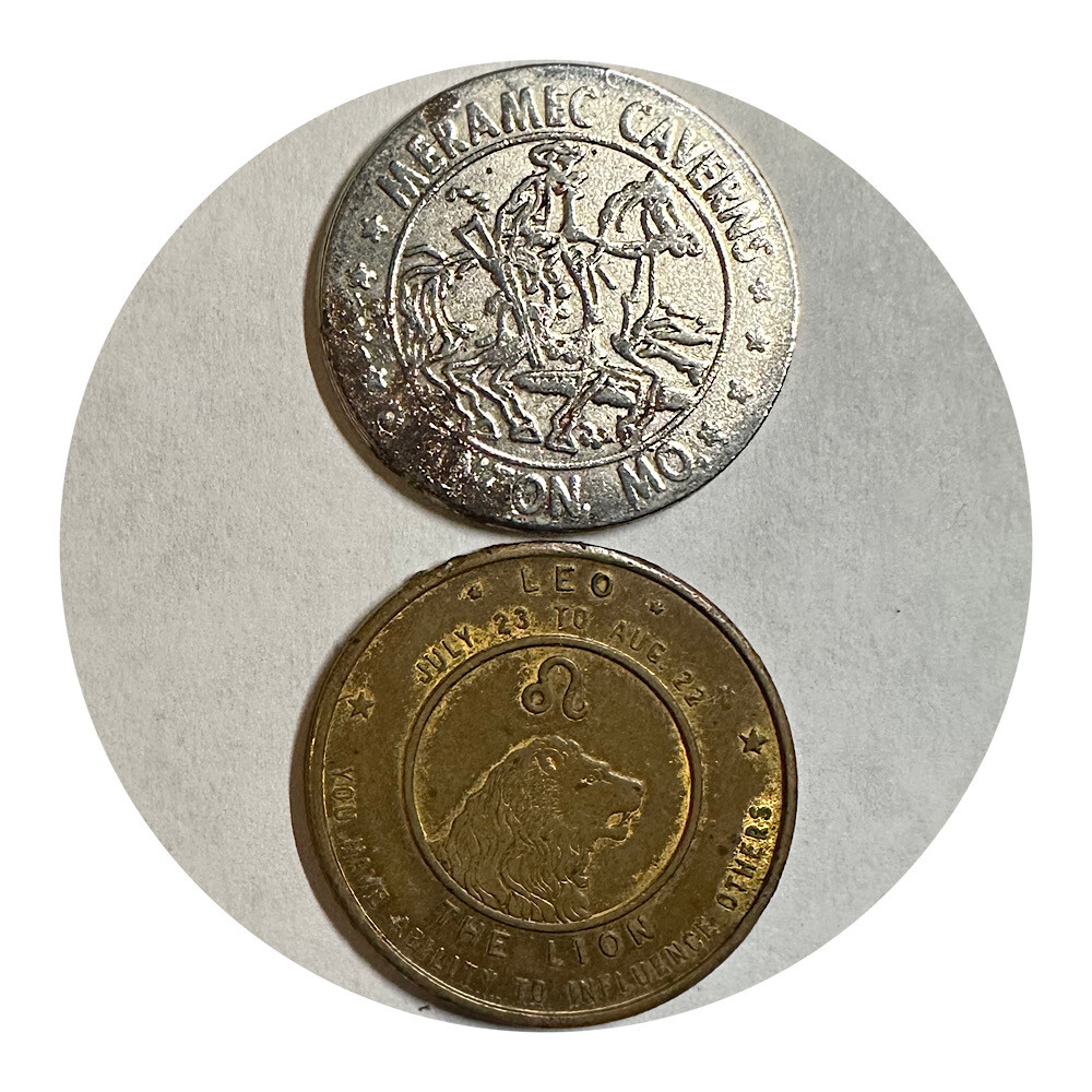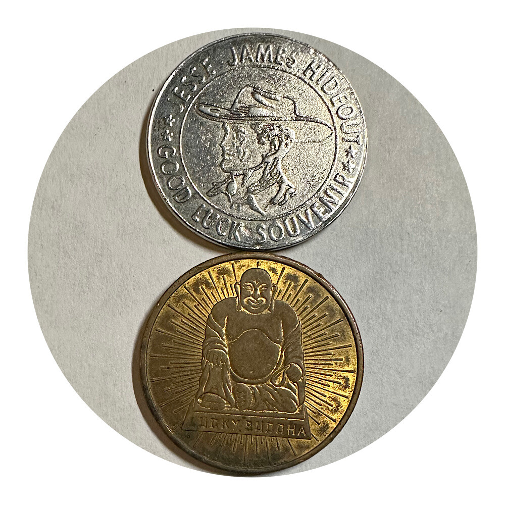 >Good Luck Tokens! Jesse James Hideout Meremac Caverns (Missouri) and Lucky Buddha-The Lion Token!