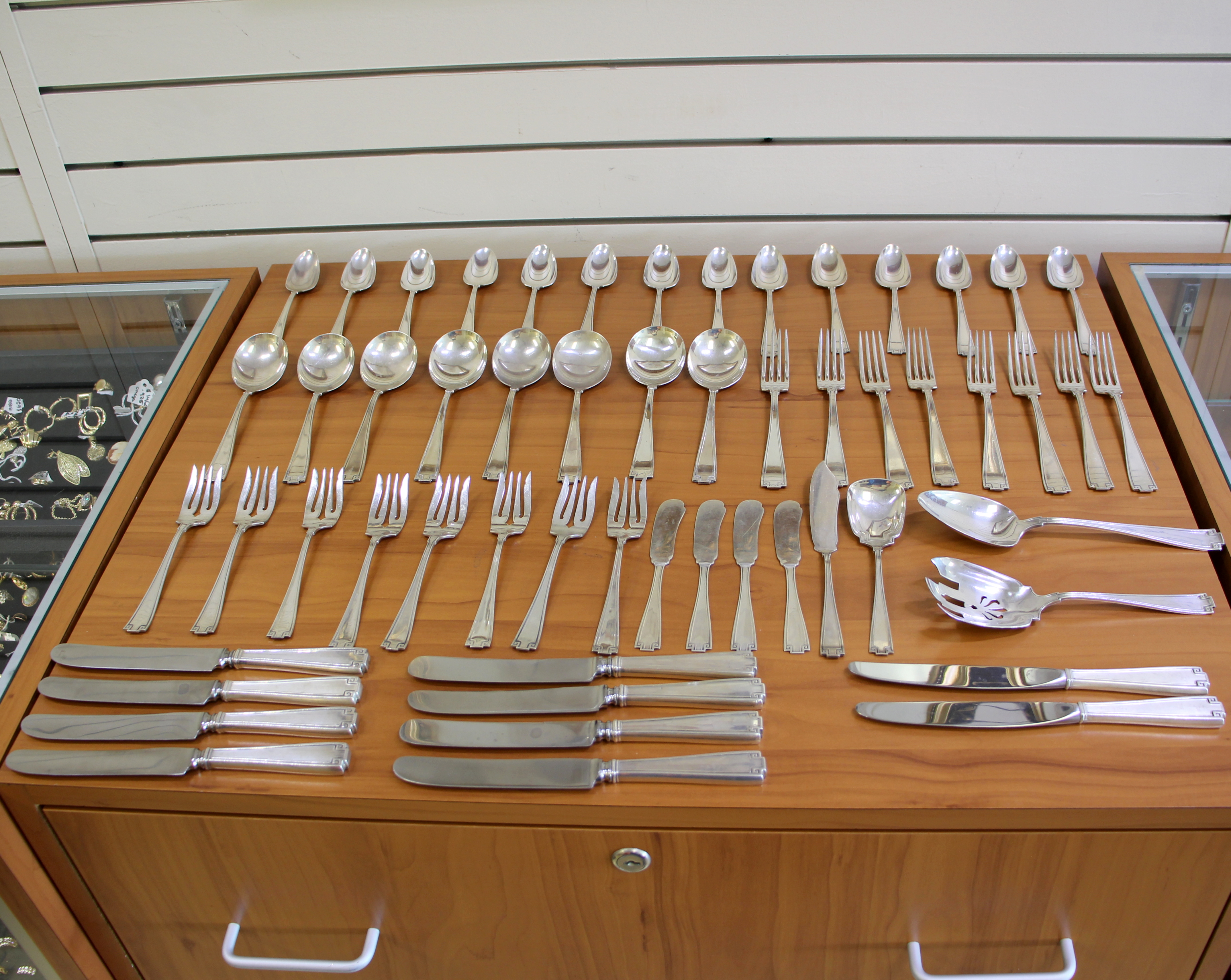 In sterling silver. Set includes: 8 forks 7 inches, 8 salad forks 6 inches, 4 and 1/4 inches, 14 teaspoons 5 and 7/8 inches, 8 round bowl soup spoons/gumbo spoons 6 and 5/8 inches, 4 flat handle butter spreaders 5 and 3/4 inches, 8 old French HH knives 8.5 inches, 2 Modern HH knives 8 and 5/8 inches, 1 solid salad serving fork 7 and 5/8 inches, 1 tablespoon serving spoon 8 and 3/8 inches, 1 sugar spoon 5 and 7/8 inches, 1 flat handle master butter knife 7 inches. Total weight: 2,248.8 grams.