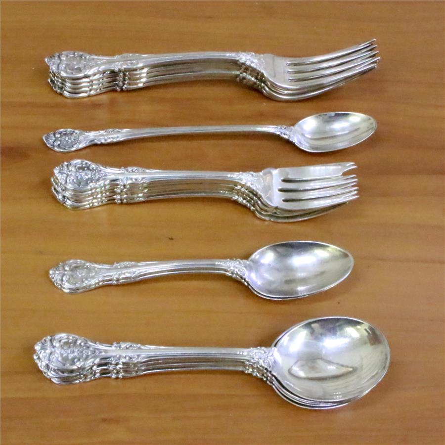 In .925 Sterling Silver. Contains five place size forks - 7 1/2 inches long, six salad forks - 6 1/4 inches long, five round bowl cream soup spoons - 6 1/4 inches long, two teaspoons - 6 inches long, and one iced tea spoon - 7 1/2 inches long. 819.1g.