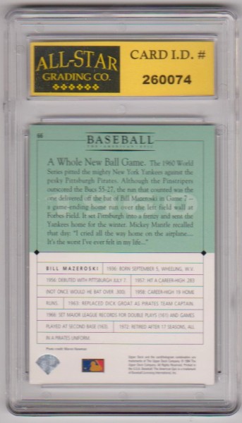 This is a Bill Mazeroski 1994 Upper Deck The American Epic #66 card that has been graded a Mint or Higher 10 by ASG.  This is a nice graded card of this baseball Hall of Famer.