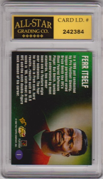 This is a Bruce Smith 1996 Stadium Club Members Only #1 card that has been graded a Mint or Higher 10 by ASG.  The holder has some light surface wear, but overall this is a nice graded card of this NFL Hall Of Famer.