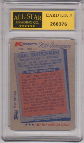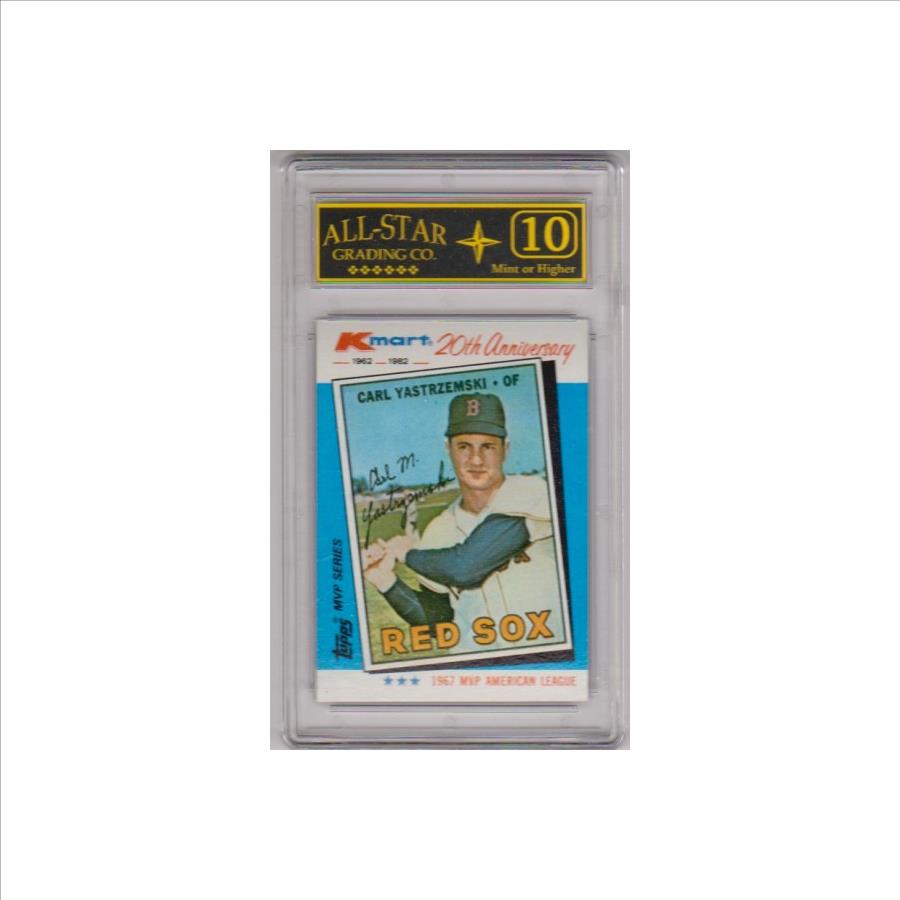 This is a Carl Yastrzemski 1982 KMart 20th Anniversary #11 card that has been graded a Mint or Higher 10 by ASG.  The holder has some surface wear, but overall this is a nice graded card of this baseball Hall Of Famer.