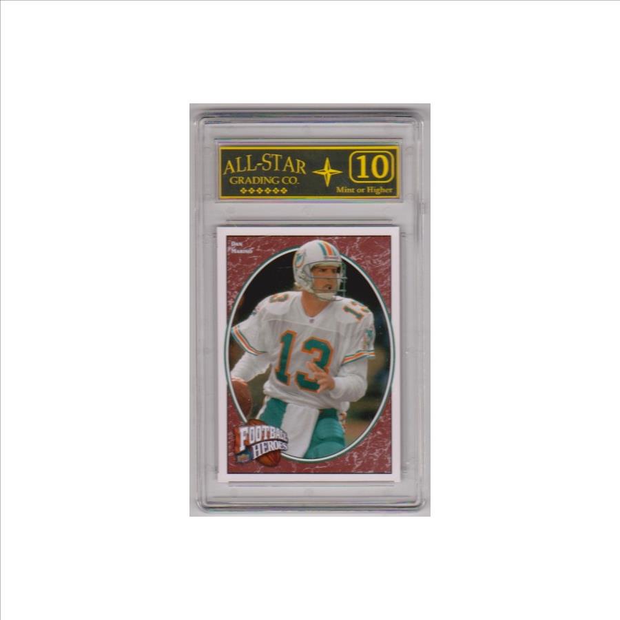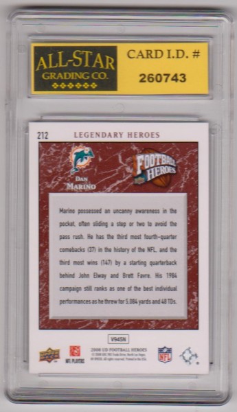 This is a Dan Marino 2008 Upper Deck Football Heroes #212 card that has been graded a Mint or Higher 10 by ASG.  The holder has some light surface wear/scuffs, but overall this is a nice graded card of this NFL Hall Of Famer.