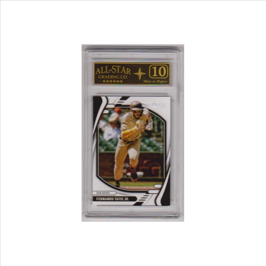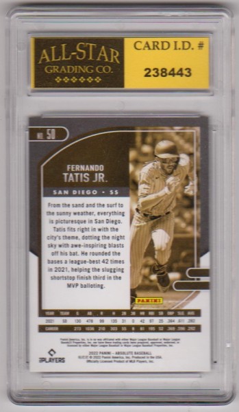 This is a Fernando Tatis Jr. 2022 Panini Absolute #50 card that has been graded a Mint or Higher 10 by ASG.  The holder has some minor surface wear, but overall this is a nice graded card of this baseball star.