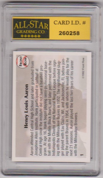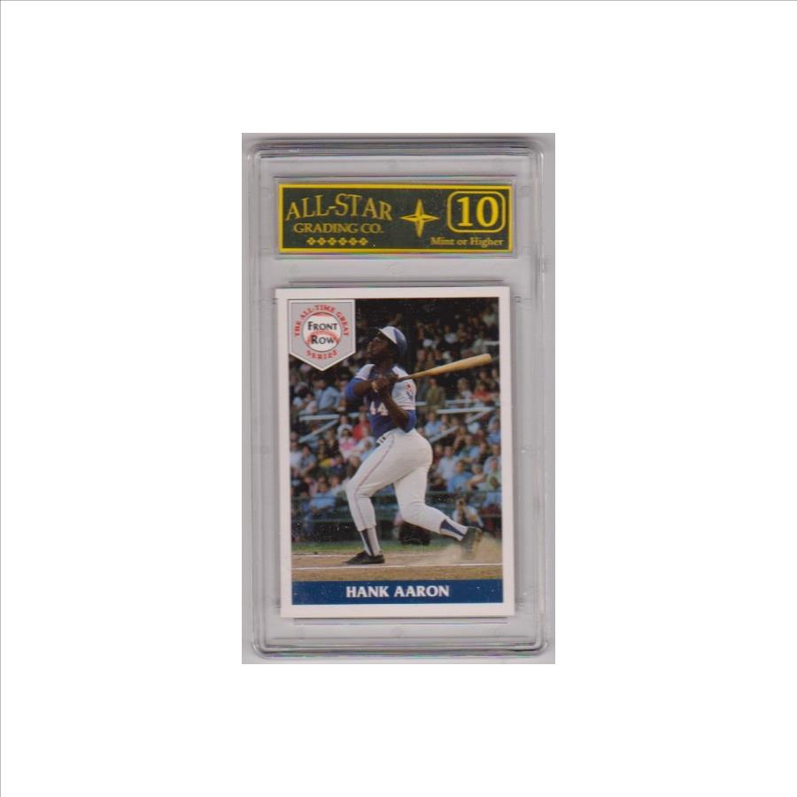 This is a Hank Aaron 1992 Front Row All-Time Great Series #1 card that has been graded a Mint or Higher 10 by ASG.  This is a nice graded card of this baseball Hall Of Famer.