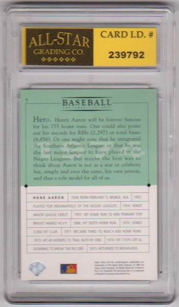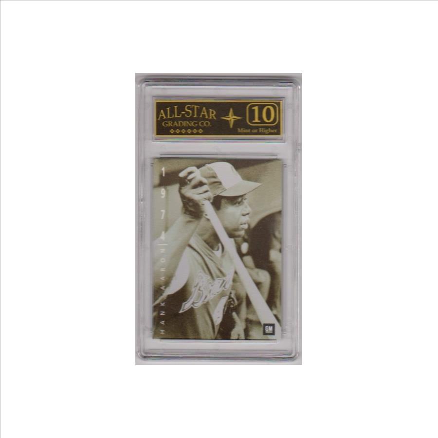 This is a Hank Aaron 1994 Upper Deck GM #1 card that has been graded a Mint or Higher 10 by ASG.  The holder has some very minor surface wear, but overall this is a nice graded card of this baseball Hall Of Famer.
