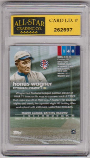 This is a Honus Wagner 2020 Stadium Club #148 card that has been graded a Mint or Higher 10 by ASG.  The holder has some minor surface wear, but overall this is a nice graded card of this baseball Hall Of Famer.