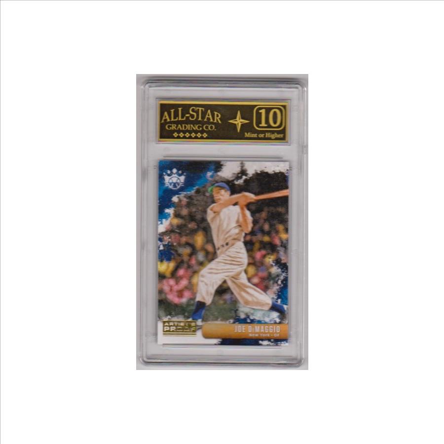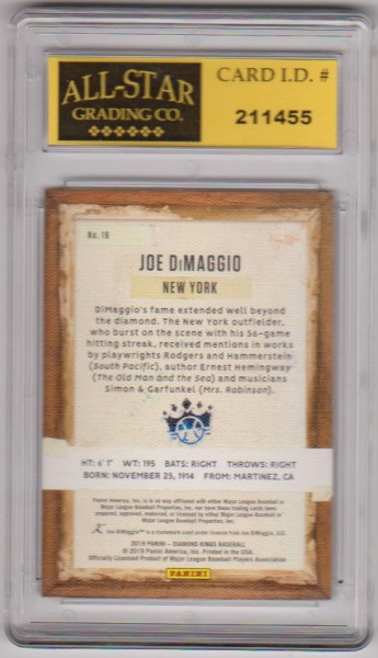 This is aJoe DiMaggio 2019 Panini Diamond Kings Artist's Proof #19 card that has been graded a Mint or Higher 10 by ASG.  The holder has some very minor surface wear, but overall this is a nice graded card of this baseball Hall Of Famer.