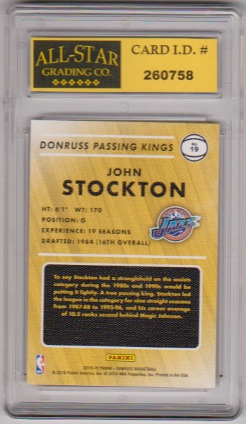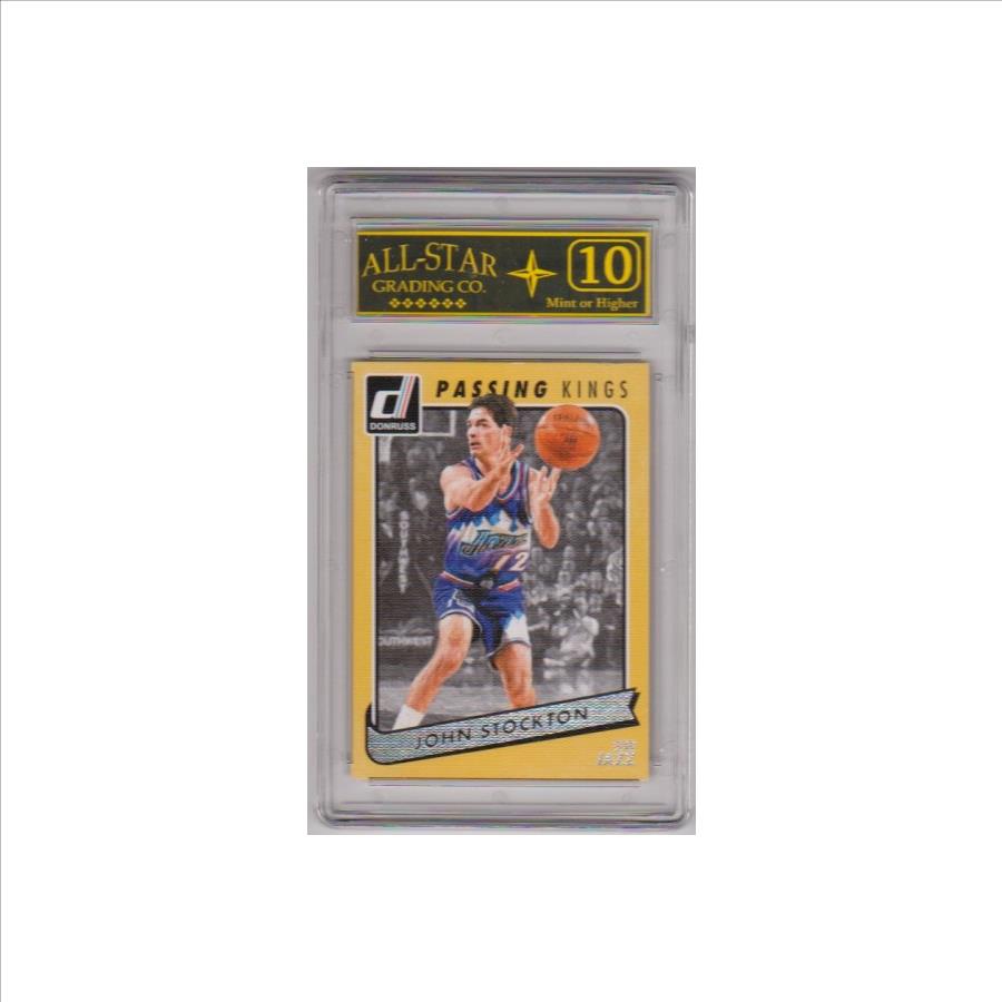 This is a John Stockton 2015-16 Donruss Passing Kings #19 card that has been graded a Mint or Higher 10 by ASG.  The holder has some very light surface wear, but overall this is a sharp graded card of this NBA Hall of Famer.
