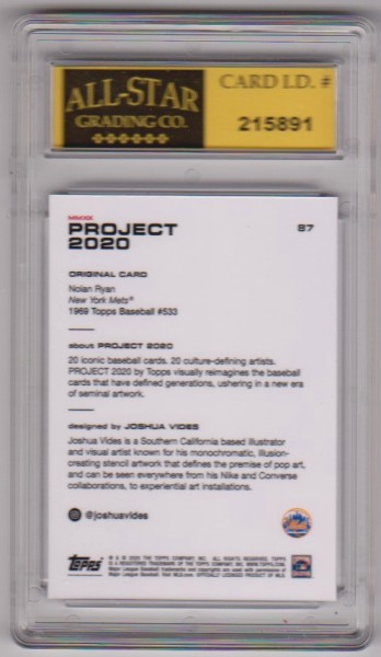 This is a Nolan Ryan 2020 Topps Project #87 card that has been graded a Mint or Higher 10 by ASG.  This is a nice graded card of this baseball Hall of Famer.