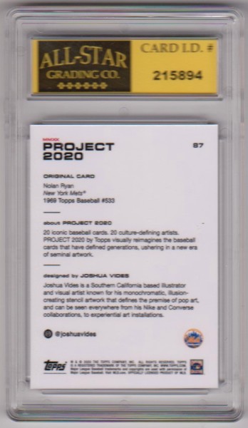 This is a Nolan Ryan 2020 Topps Project #87 card that has been graded a Mint or Higher 10 by ASG.  This is a nice graded card of this baseball Hall of Famer.