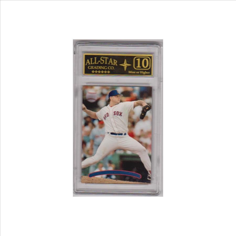 This is a Roger Clemens 1996 Stadium Club #25 Missing Foil Error card that has been graded a Mint or higher 10 by ASG. All of the gold foil, including Clemens name, is missing from the front of the card. The holder has some light surface wear, but overall this is a nice graded card of this retired baseball star.