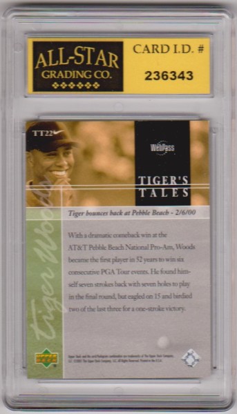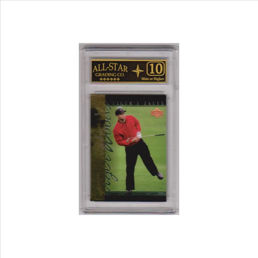 This is a 2001 Upper Deck Tiger's Tales Tiger Woods #TT22 insert card that has been graded a Mint or higher 10 by ASG.  This is a nice graded card of this golfing great.