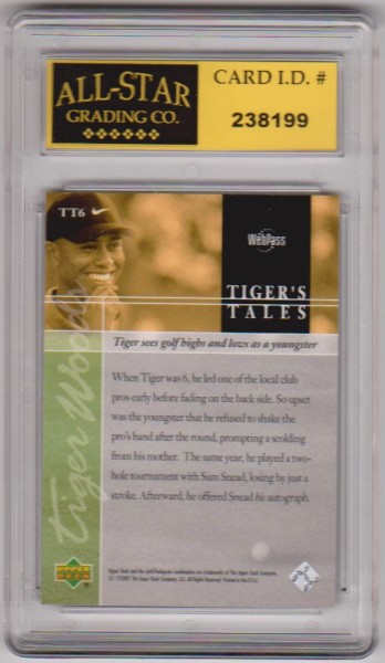 This is a 2001 Upper Deck Tiger's Tales Tiger Woods #TT6 insert card that has been graded a Mint or higher 10 by ASG.  This is a nice graded card of this golfing great.