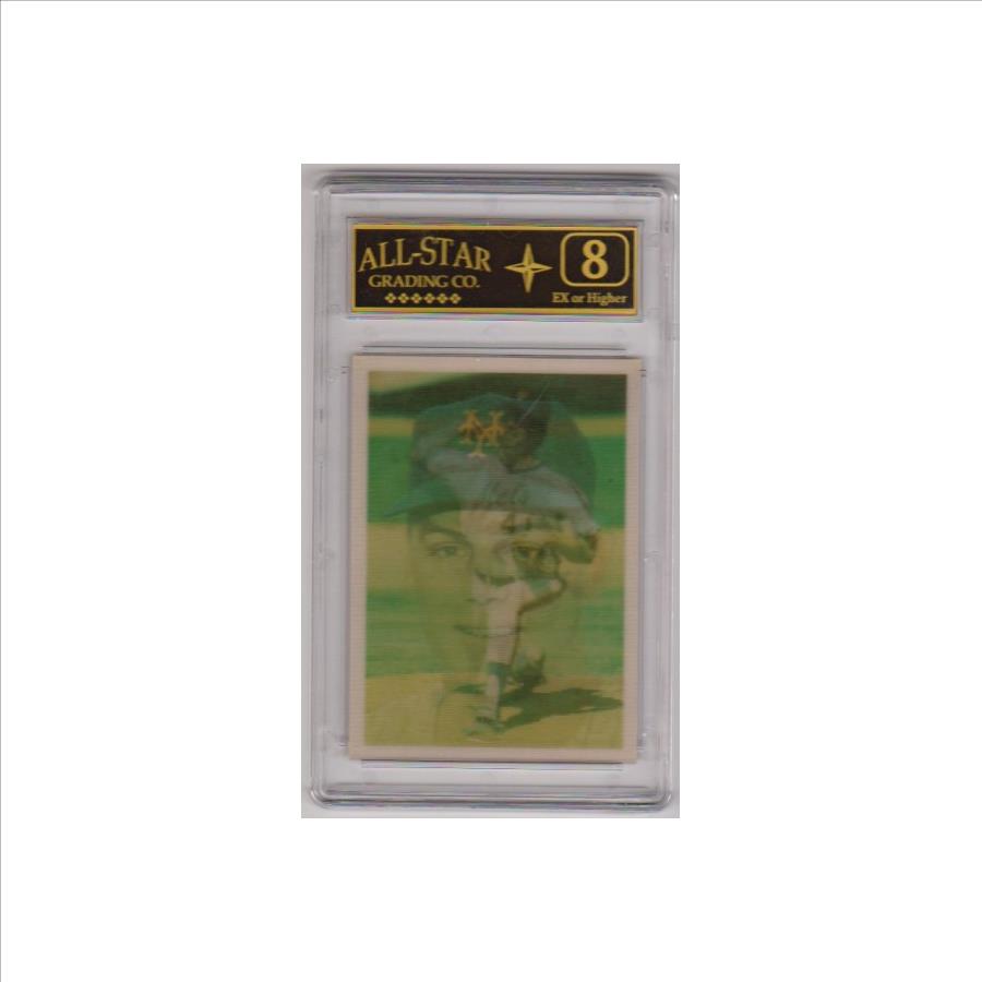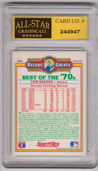 This is a Tom Seaver 1986 Sportflics Decade Greats #52 card that has been graded an EX or higher 8 by ASG. The holder has some surface scuffs, but overall this is a nice looking graded card of this baseball Hall Of Famer.