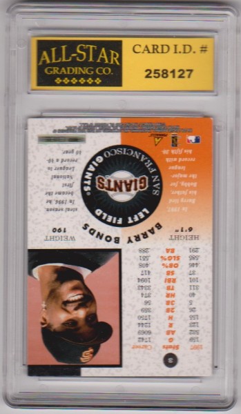 This is a 1998 Pinnacle Mint Collection Barry Bonds #3 card that has been graded a NM or Higher 9 by ASG.  The holder has some minor surface wear, but overall this is a nice graded card of this retired baseball star.