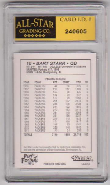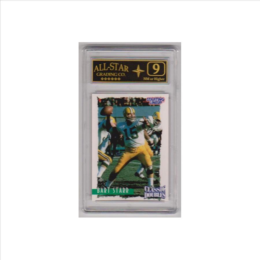 This is a Bart Starr 1997 Starting Line Up Classic Doubles card that has been graded a Near Mint or higher 9 by ASG.  The holder has some light surface wear, but overall thiis is a nice graded card of this NFL Hall Of Famer.