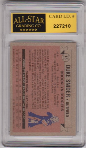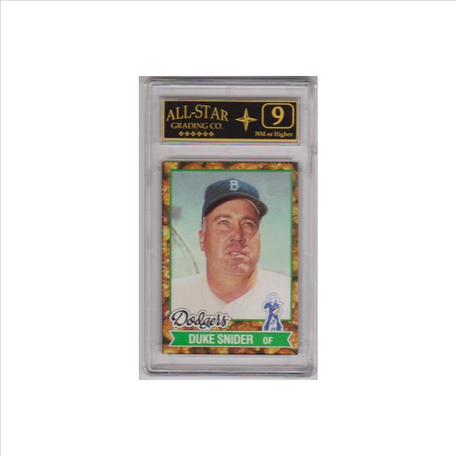 This is a Duke Snider 1982 Topps Cracker Jack #15 card that has been graded an NM or Higher 9 by ASG.  The holder has some surface wear including a scuff on the back, but overall this is a nice graded card of this baseball Hall of Famer.