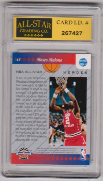 This is a Moses Malone 1992-93 Upper Deck All-Star Weekend #17 card that has been graded a NM or higher 9 by ASG.  The holder has some light surface wear, but overall this is a nice graded card of this NBA Hall of Famer.